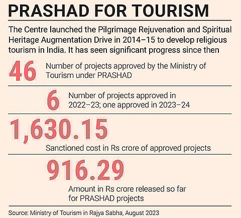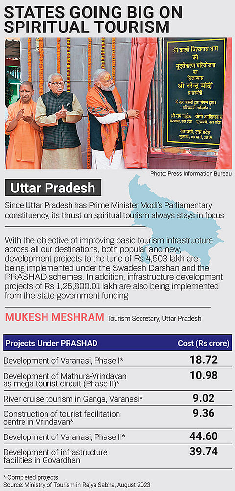 In December 2021, Prime Minister Narendra Modi inaugurated the Kashi Vishwanath corridor, connecting the Kashi Vishwanath temple to the adjacent Ganga river. The sprawling corridor, spanning over five lakh square feet and constructed at a cost of Rs 339 crore, houses 23 buildings, including a tourist facilitation centre, city museum and viewing gallery among others. Ten months later, in October 2022, Modi inaugurated the magnificent Mahakal Lok corridor in Ujjain, which was constructed at an estimated cost of Rs 860 crore.