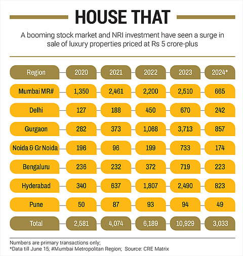 Luxury real estate has seen a bump in recent times. CRE Matrix, a real estate data analysis platform, says that there has been a year-on-year increase in primary sales of luxury property priced Rs 5 crore and above in seven cities in India. The numbers have increased from 2,581 units sold in 2020 to 10,929 in 2023. Sales recorded till June 15 this year stand at 3,033 houses including villas and apartments. Last year Gurgaon recorded the highest sales in this segment with 3,713 units being sold across four quarters.