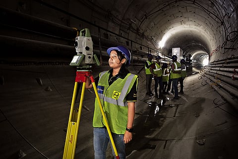 On a sultry summer day in April, the kind that saps all your energy, I walk down a flight of spiral staircase that takes me 22 metres below Bengaluru’s MG Road to the spot where the Bengaluru Metro Rail Corporation (BMRCL), through Larsen & Toubro (L&T), is carrying out its tunnel construction for the underground section of a line, set to run between Gottigere and Nagawara, at full steam. Amidst the cacophony of machines and enveloped in heat and grime is 25-year-old Pallabi Modak, busy at work. Perched atop a four-metre-tall gantry crane, Modak can be spotted noting down the survey coordinates from the navigation instruments fixed on the tunnel’s ceiling.