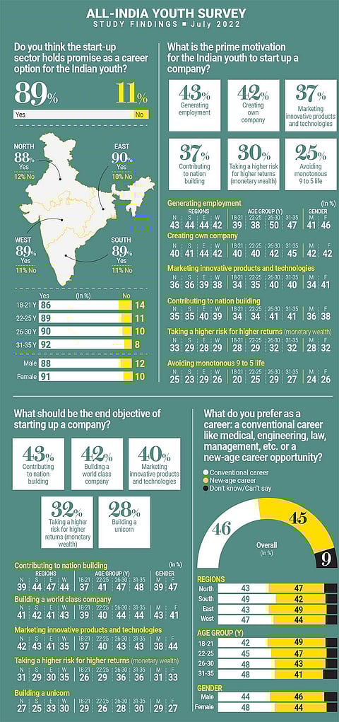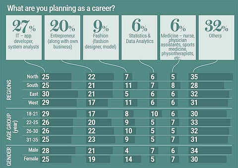 According to the Outlook Toluna Youth Survey 2022—a first-of-its-kind study done across India—90% of the respondents thought that start-ups were a promising career option for them. Clearly, the rise and shine of Indian start-ups has fuelled the entrepreneurship buzz in India. The survey also found that traditional career choices, such as law, medicine, management or engineering, were almost neck and neck with new-age careers, such as app development, system analysing, entrepreneurship, fashion and sports among others—46% respondents chose the former, while 45% chose the latter.