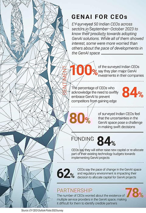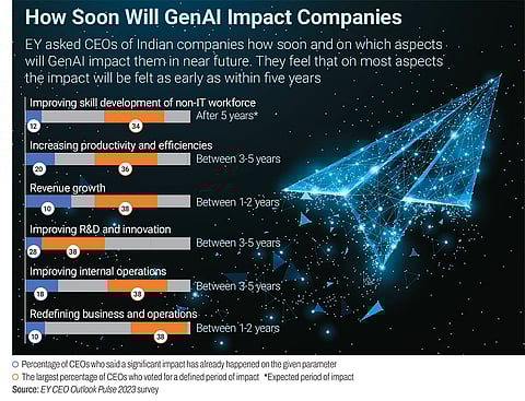 The EY survey, which also covered 50 Indian CEOs, confirms that GenAI conversations are much more vigorous in Indian companies than in other parts of the world. EY India says that “... [84% of Indian CEOs recognise] the imperative for their organizations to act promptly on GenAI to prevent competitors from gaining a strategic edge”. These CEOs—80% of them—made a startling admission that GenAI will force them to cause disruption in their own business model lest competitors score over them. Most interestingly, all the surveyed CEOs conceded that they cannot ignore GenAI and are devising ways to integrate it into their processes.