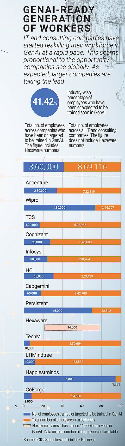 Its rival Wipro has made an even bigger announcements on upskilling its workforce for AI. While announcing an investment of $1 billion in harnessing and innovating AI capabilities in July last year, the company announced that it would train all of its 2,50,000 employees in AI fundamentals within one year. A significant part of this investment and training is likely to revolve around GenAI, given the momentum building around it lately.