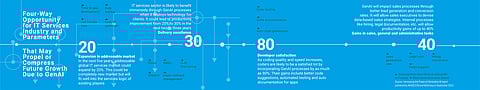 Facing uncertainty about how much the client will pay for a lesser headcount, the increase in GenAI conversations has made IT companies review their revenue mix. Rather than looking at what percentage of their revenue is GenAI-enabled, the companies evaluate what percentage of their deal has a GenAI element. Cresting this curve is akin to the same value migration the IT industry saw over the last 25 years, which started with offshoring and was later fortified with digital transformation.