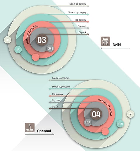 The metros, or Tier I cities, with population of over 50 lakh, have performed much better than their smaller counterparts on a large number of metrics. Cities in southern region have performed better than the ones in northern and even western regions. Bangalore leads the pack by a huge margin. The next two cities, viz. Mumbai and Delhi, have scores which are at least 30% to 40% lower than that of Bangalore in various categories. There is, again, a significant drop, in the score of the fourth ranked city, i.e., Chennai, as compared to the third ranker Delhi. However, the scores of next few ranked cities drop at a lower rate after that.