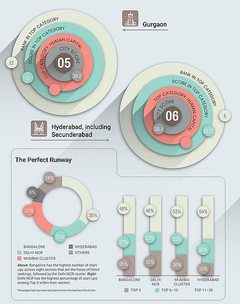 A prominent legacy aspect is subsumed in most of these factors. City rankings show that Bangalore is ranked at the top with a margin that is almost unbeatable in the near future. Its stellar performance appears in categories which are not just weighted the highest, but also require multiple years, even decades, to build. Bangalore, as India’s own Silicon Valley, clearly has the first mover advantage. It is in this city where, even before start-up became a buzz word, India’s first start-ups were born, grew and either flourished or died. This cycle of life and death created a vibrant start-up ecosystem where hope has existed in close proximity to a Darwinian process of natural selection. The city, therefore, remains the top choice of most budding start-ups and hosts more than a third of all growth-stage start-ups in the sectors covered in the Outlook Start-Up Outperformers 2023 rankings. Likewise, Mumbai and Delhi will keep competing with each other for the runner’s up position. The race, among cities other than these three, is, therefore, for the fourth position onwards.