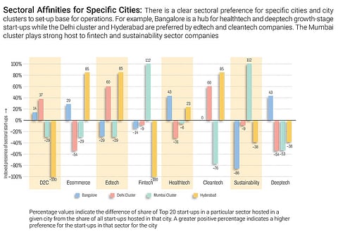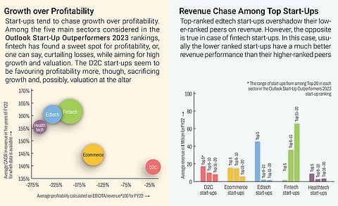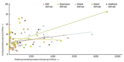 Some correlation exists between total funding of a start-up and total portfolio of all its investors taken together. This correlation is highest among edtech companies and lowest in the ecommerce sector. A slanted trend line at an angle of almost 45 degrees shows a robust correlation. Dots represent individual start-ups, whose proximity to trend lines suggests a healthier correlation. The above trend lines, thus, show that edtech companies funded by larger investors had greater chance of securing higher funding. However, this argument does not hold for ecommerce companies.
