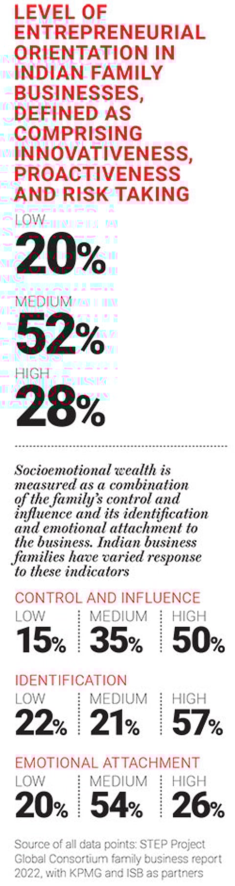 Nupur Pavan Bang, associate director of the ISB’s Thomas Schmidheiny Centre for Family Enterprise, which conducted the survey in India, says that the Indian firms show a higher emotional attachment of Indian family business leaders to their family firms in comparison to their global counterparts. “A greater proportion of Indian businesses is being managed by the third and fourth generations when compared to the global averages. This is an indication of the longevity of family firms in India. However, the Indian firms lag behind the other global family businesses on the key aspect of involving women at the leadership level,” she says.
