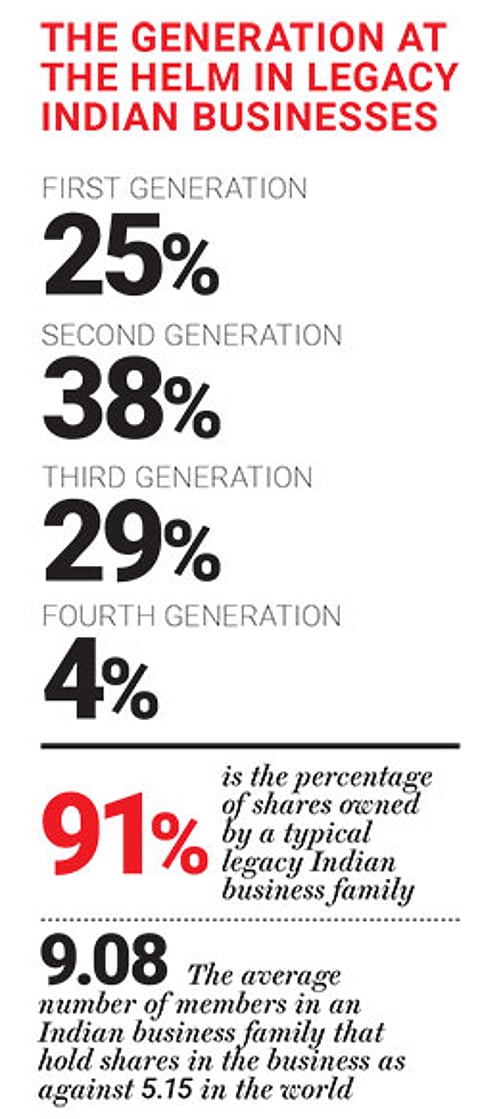 Wealth historians have spotted the trend globally that business families tend to lose steam by the time they hit the third generation. India is a different territory though. A study on family businesses conducted by KPMG and the Indian School of Business (ISB) as part of the STEP Project found that Indian business families buck the shirtsleeves-to-shirtsleeves trend and have more tenacity going into the third and fourth generations. It found that the management of Indian businesses with the third and fourth generations stood at 25% and 8% respectively out of the 53 firms surveyed, while the corresponding global averages were 14% and 4%.