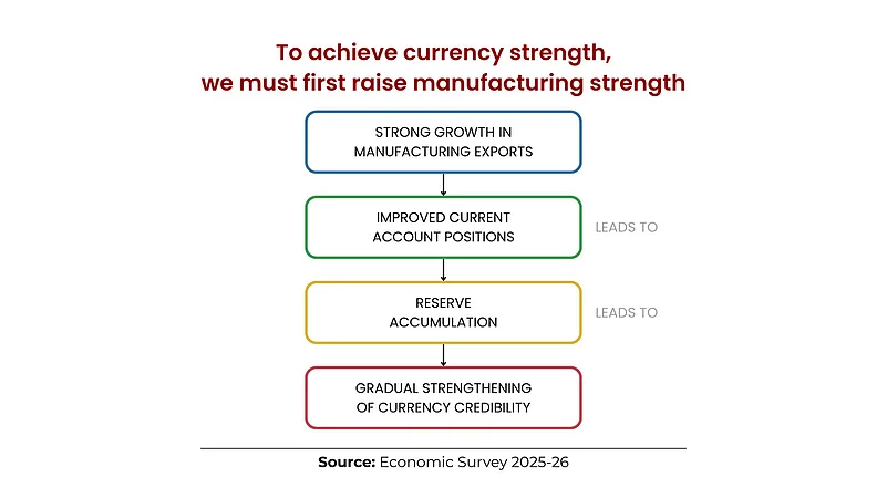The report stated that what stabilizes a currency is an ‘economy that reliably earns foreign exchange.’ Drawing parallels from other Asian economies, strong manufacturing exports remain one of the key factors that can improve current account positions, accumulating forex reserves, and gradually strengthening the currency credibility. The report noted that unless India’s export capacity expands in line with its import bill, growth will continue to weigh on Balance of Payments (BoP).