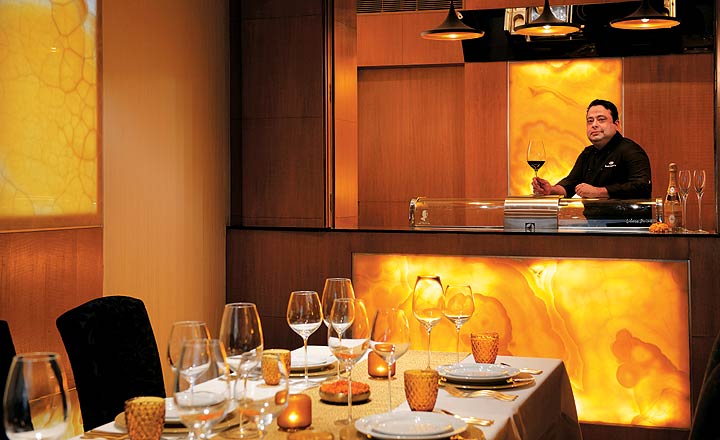 The restaurant hosts a Chef’s Table, a private dining room that can accommodate a maximum of nine guests. The wood-paneled room dons a minimalist look but it changes character once the show begins. The room has a window that opens into the kitchen where chef Mehrotra is seen preparing the feast of the day while interacting with the diners. How much does it cost to see the chef at work? Mehrotra says it can range anywhere between Rs.50,000 for eight guests to Rs.75,000 for just a couple.