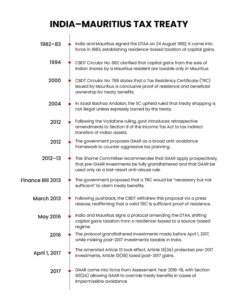 Under the reworked treaty, a full capital gains tax would be made applicable to investments routed through Mauritius, after a two-year transition period stretching from 2017 to 2019. The new treaty also allowed higher scrutiny of the ownership structures of Mauritian firms through GAAR or General Anti-Avoidance Rule, which would help pinpoint the true identity and location of the owners.