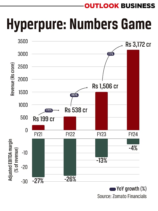While Blinkit’s revenue for FY24 almost tripled to Rs 2,300 crore from the previous year, Zomato’s B2B grocery business—Hyperpure—also returned impressive numbers. The revenue from the B2B arm that delivers groceries and other necessities to the Horeca (Hotel, restaurant and cafe) segment doubled year-on-year in FY24 to Rs 3,172 crore.