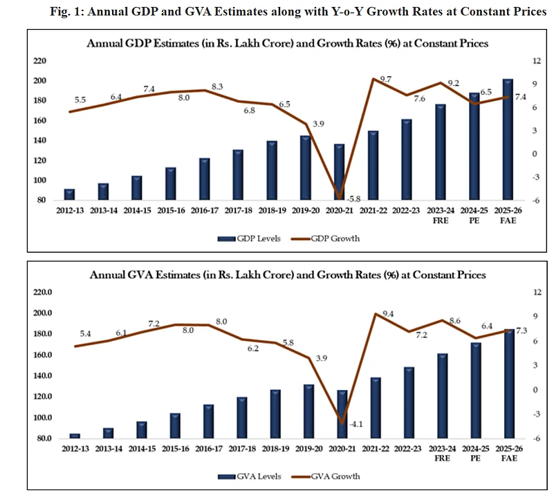 India’s real GDP is estimated to have grown 7.4% in FY26, up from 6.5% a year earlier, according to first advance estimates.
