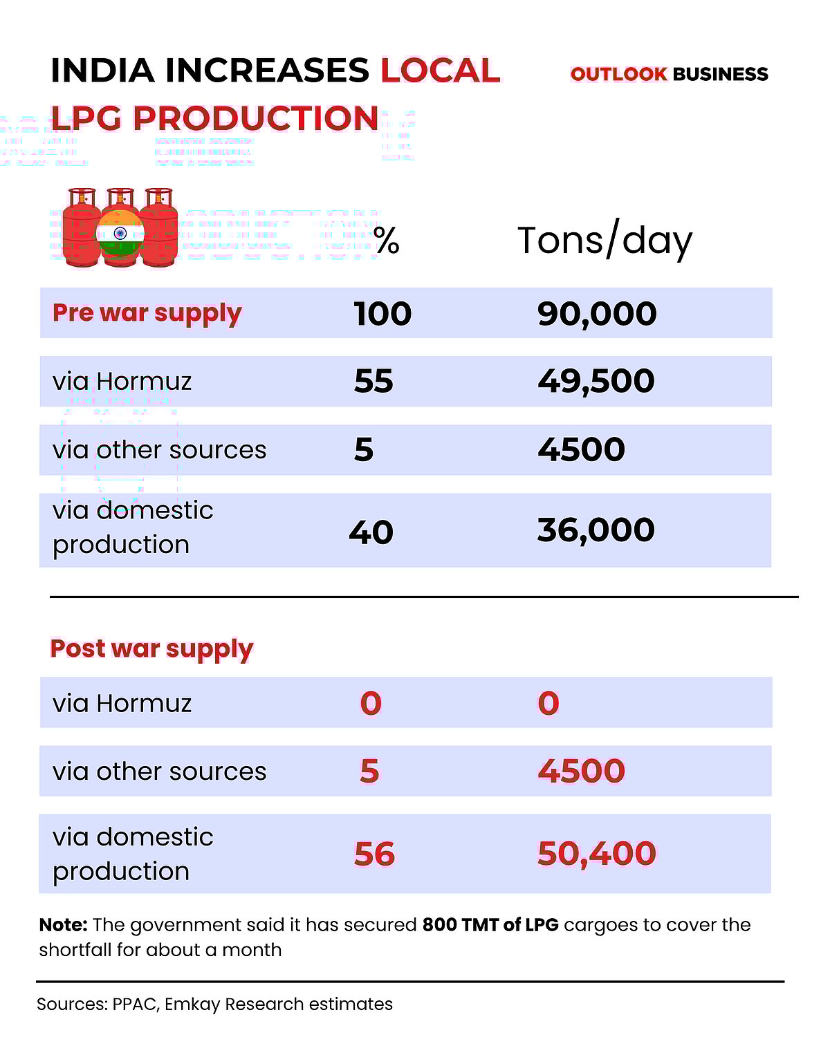 According to a press release issued by the Ministry of Petroleum and Natural Gas, domestic refinery output of LPG, following the LPG Control Order, has been ramped up by 40%, taking daily LPG production to 50 Thousand Metric Tonnes or TMT, over 60% of India’s roughly 80 TMT daily requirement. This has reduced the net import requirement to about 30 TMT per day.
