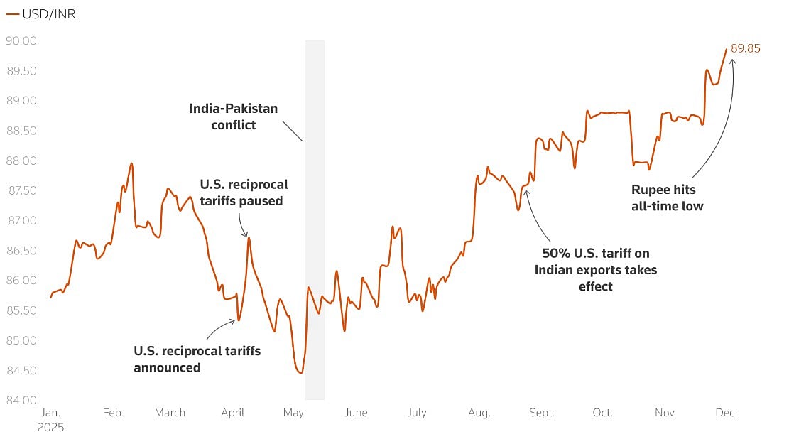 The Indian rupee is the worst-performing Asian currency in 2025, falling to a record low of 89.95 per dollar amid Trump’s tariff shocks, foreign outflows, and uncertainty around the India–US trade deal.