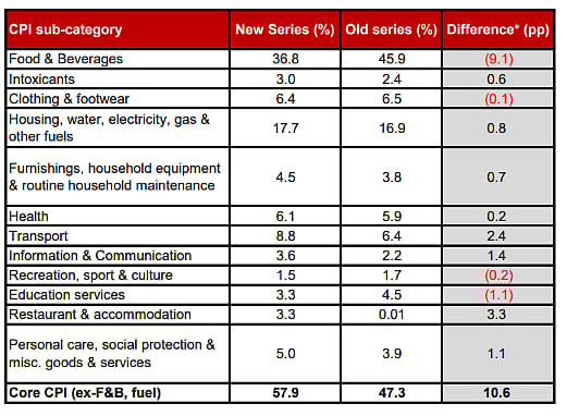 One of the most awaited revamps in the new CPI series is the recalibration of weights in food and beverages. In the new series, the weight of food and beverages has fallen to 36.8% from 45.9%, with food alone dipping to 34.8% from 39.1%.
