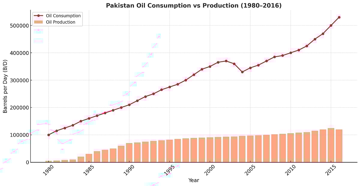 Pakistan produces 88,262 barrels per day (bpd) of oil, making it 53rd in the world and consumes 5,56,000 bpd of oil, shows data from 2016. It imported 24% of its oil consumption, 1,35,201 bpd, in the same year.