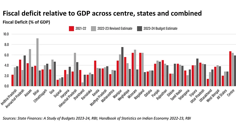 States’ consolidated gross fiscal deficit (GFD) to gross state domestic product (GSDP) ratio declined from 4.1% in 2020-21 to 2.8% in 2021-22 because of moderating revenue expenditure and increasing revenue collection. Some states have budgeted for fiscal deficits exceeding 4% of GSDP in 2023-24 vis-a-vis the all-India average of 3.1%. They also have debt levels exceeding 35% of GSDP as against the all-India average of 27.6%.