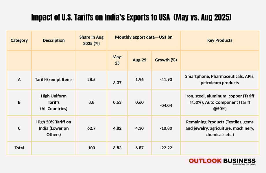 "September will be the first full month where all Category C exports face 50% tariffs, meaning the declines in textiles, gems and jewellery, shrimp, chemicals, and solar panels could deepen further," Srivastava warned.