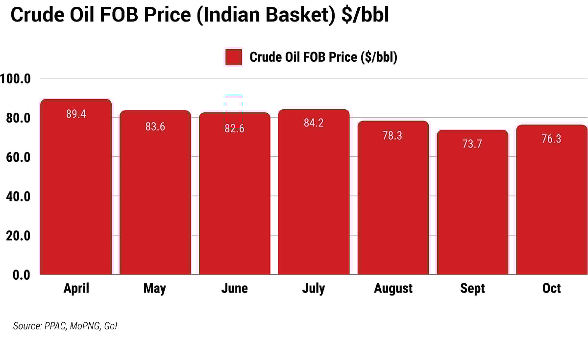 According to data from the Petroleum Planning and Analysis Cell of the Union Ministry of Petroleum and Natural Gas, the price of crude oil (Indian basket) reversed in October after witnessing a decline for several months.