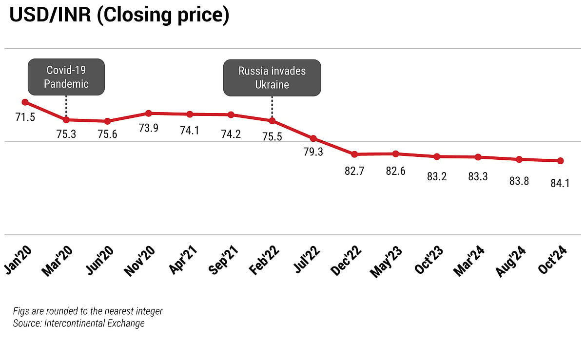 The Indian Rupee fell to a record low of 84.07 against the US dollar on October 22, 2024, according to the Intercontinental Exchange (ICE).
