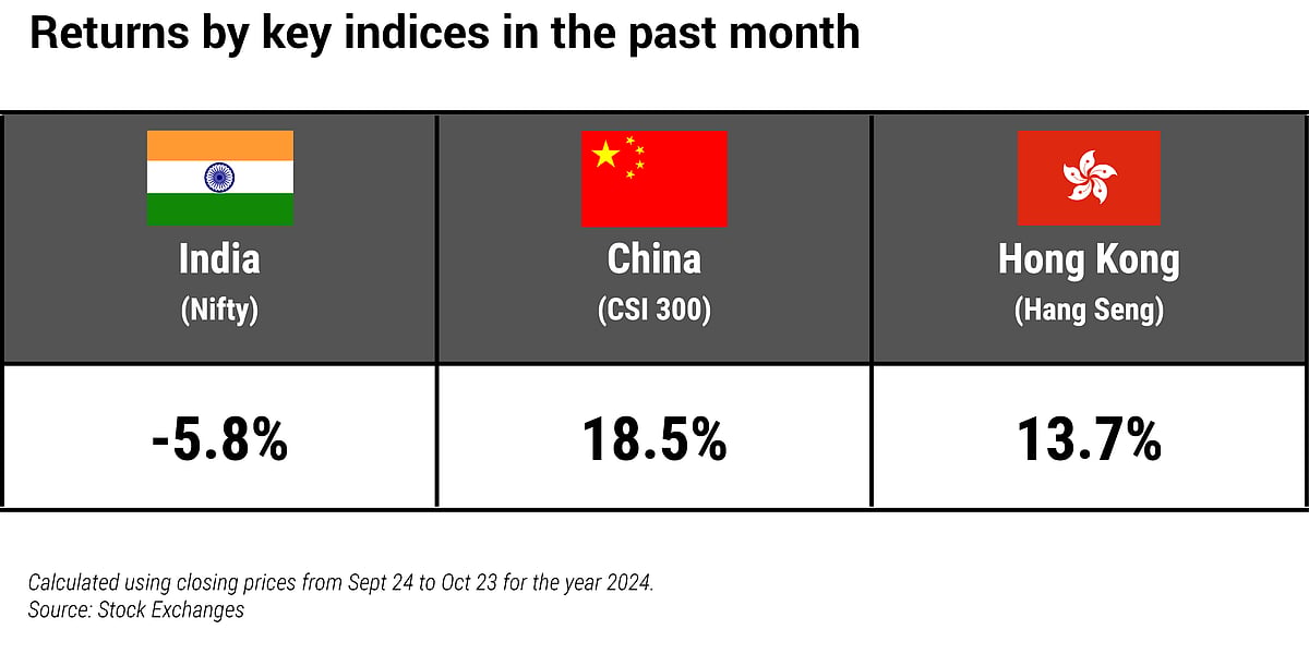 In late September, China’s central bank announced bold monetary support measures to boost its struggling economy. These steps led foreign investors to change their stance on China. However, the positive outlook for China has come at the expense of India.