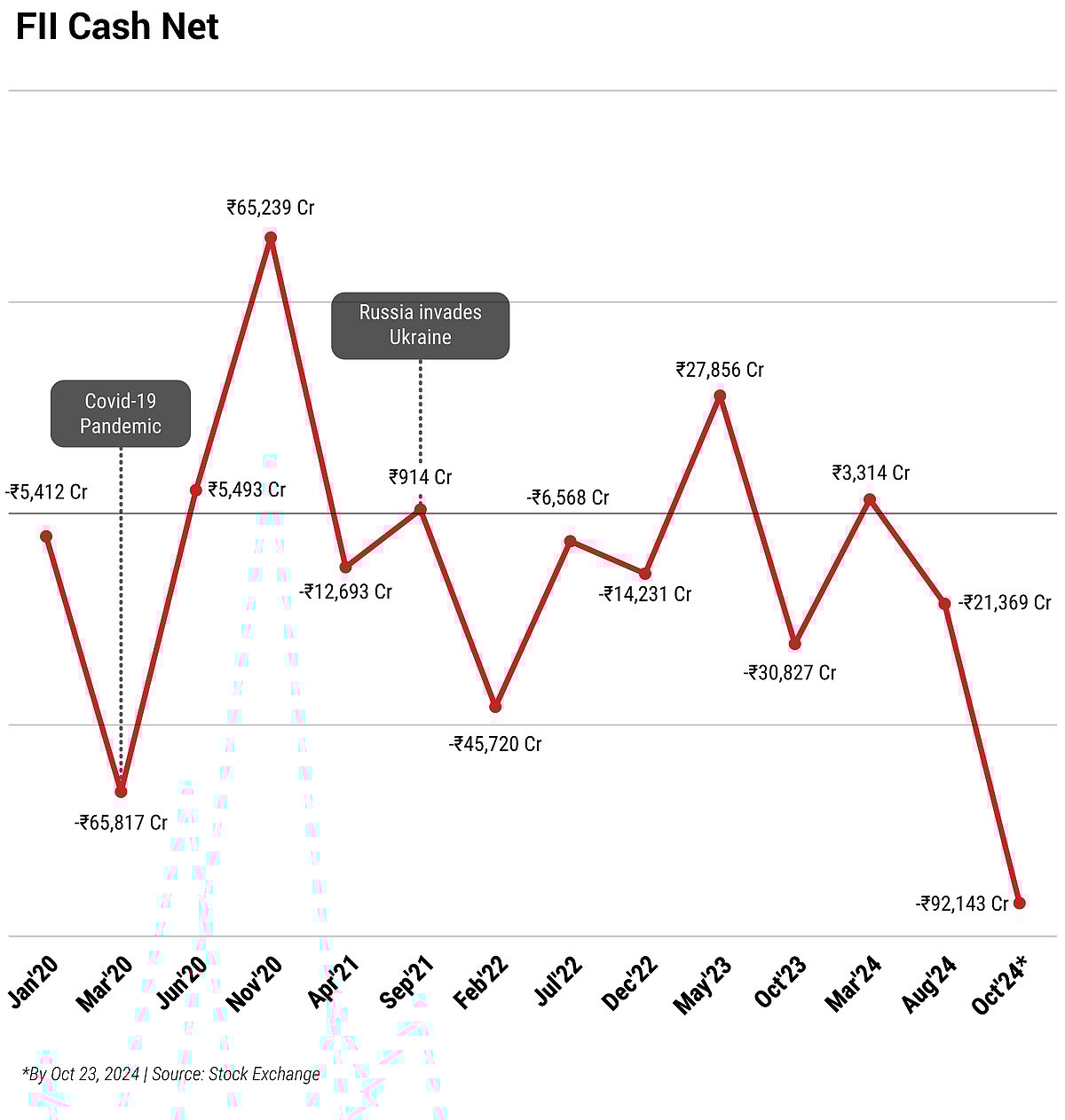 Data from the stock exchange shows that in October, foreign institutional investors (FII) sold Indian stocks worth over Rs 90,000 crores on a net basis. The outflow in October exceeds the monthly outflows seen during the Covid-19 pandemic in March 2020.