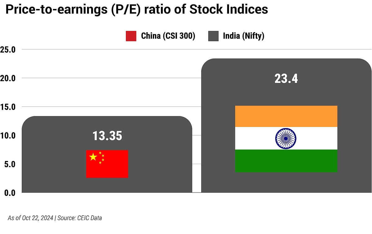The strategy of ‘sell India, buy China’ is increasingly gaining momentum among the investor community. One reason for this is that Chinese stocks are available at cheaper valuations than Indian stocks. Nifty50, India's benchmark stock index, is trading at 23.4 times its 12-month price-earnings, while China's CSI 300 is trading at 13.4 times.