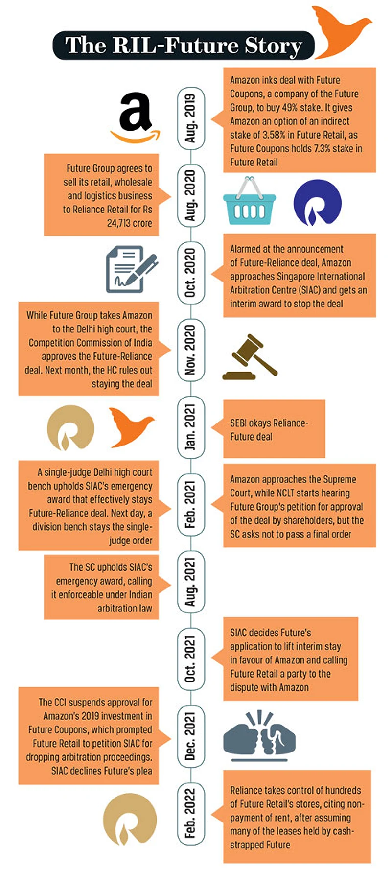 On the other hand, Bezos, for whom FRL could have been a gateway to enter India’s brick-and-mortar retail market, has been left with a favourable ruling from SIAC and the Supreme Court of India. A retail analyst, who has tracked the RIL-Future Group deal for two years and does not want to come on record, says “After a point, it became a battle of egos between Bezos and Ambani. Knowing that things were going to get difficult legally, Ambani came up with a practical plan to get maximum out of the deal without spending anything, whereas Bezos can be happy about the fact that Reliance could not get the kind of advantage it had originally thought of.”