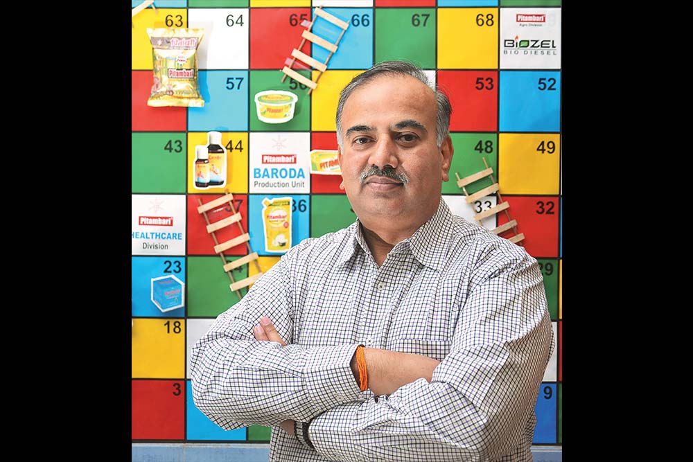 Pitambari powder, which Prabhudesai, a chemistry graduate, created in the early 1980s, has helped the group grow from an initial investment of ₹50,000 to a turnover of ₹70 crore in FY12 and a headcount of over 600 employees. The flagship product still brings in 60% of sales and is the unquestioned category leader with a 95% share of the metal-shining powder market.