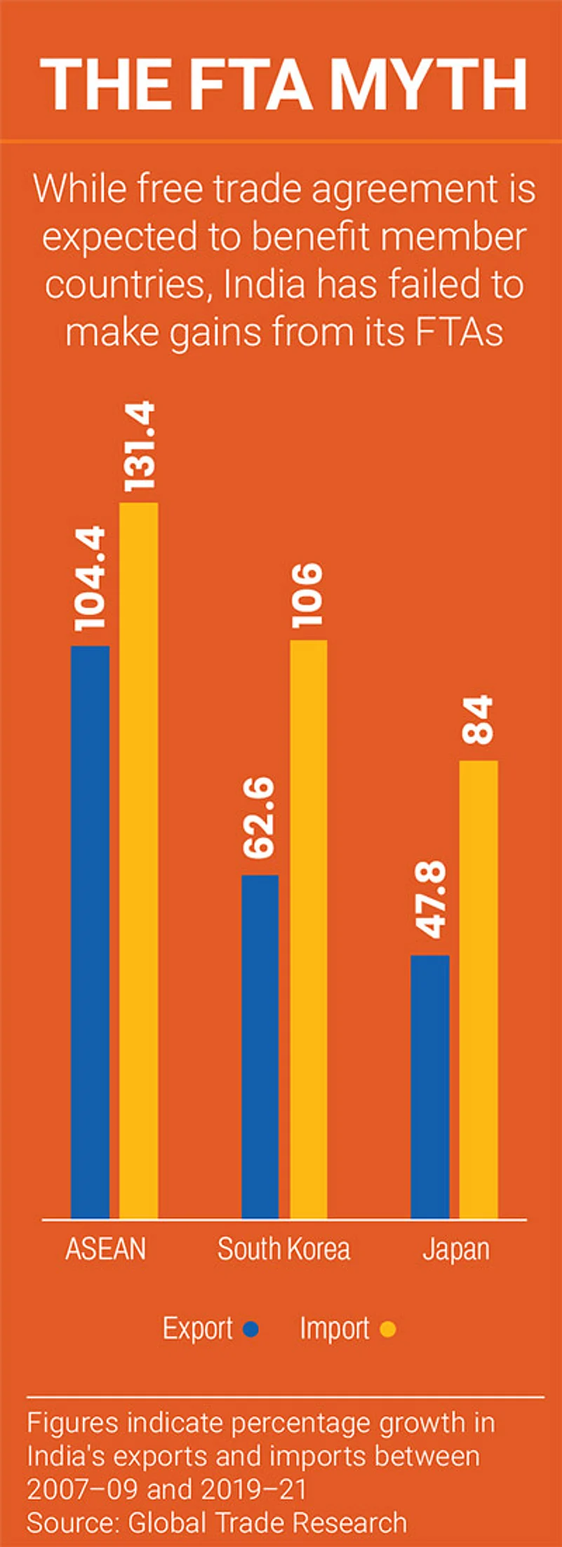Even the free trade agreements (FTAs) have failed to do much for India. According to a report by Global Trade Research Initiative, a research group, India has gained little from FTA. This is because while its tariffs are high, those of its partner countries are significantly lower. Eliminating duties in India gives partners an immediate cost advantage, while Indian exporters do not get any additional market access. Also, India’s imports from FTA partners have grown at a much higher rate than exports.