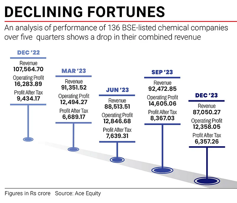During the pandemic, lockdowns and travel bans disrupted the global supply chains. This prompted companies to order excessive inventories, which temporarily boosted the sales of Indian chemical companies. However, the orders decreased as the supply chain situation improved and competition in the global market intensified.