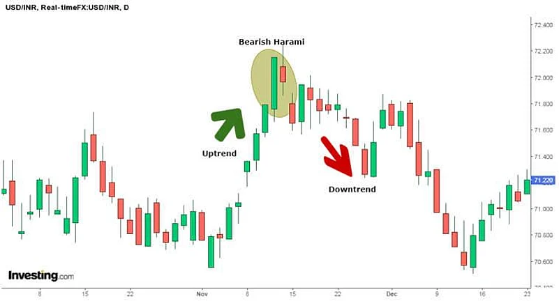 For example, to spot a Bearish Harami candlestick pattern, the prior trend should be an uptrend as Bearish Harami is a bearish reversal candlestick pattern and indicates reversal to the downtrend.