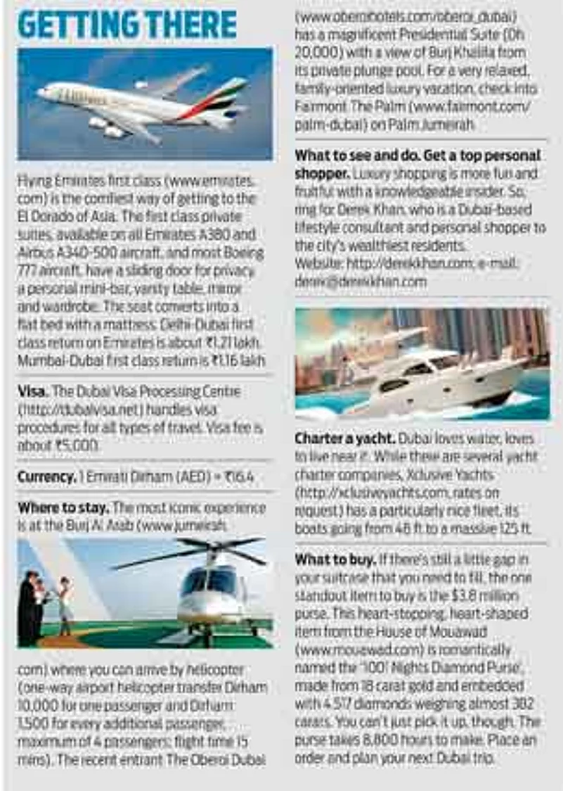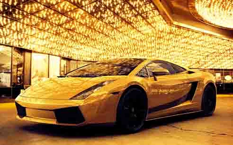 We hope you had a pleasant arrival at the hotel on your last trip to Dubai? Did your Rolls Royce have to stop at one or two traffic signals? Well, this time, just take the helicopter. The airport pickup service offered by Burj Al Arab (www.jumeirah.com) gives you a panoramic view of Dubai before the copter touches down at the hotel’s helipad on level 28. The Royal Two Bedroom Suite (Dirham 29,200) at Burj Al Arab has its personal elevator (no need to inhale someone else’s perfume), own cinema room, 24-hour butler service, private bars, two full-size Jacuzzis, and a 24 carat gold iPad for the guest during the stay. In case you’re a fussy sleeper, the suite has 17 types of pillows. A power nap later, it’s time to let the fun begin. Before bidding for the gold Lamborghini, you’ll want to get a feel of being in the driving seat of a supercar, right? Dubai Autodrome (http://luxuryracingexperience. com, from Dirham 590) has a choice of beauties: Ferrari F430; Ferrari 458 Italia;Lamborghini Gallardo LP 560; Lamborghini Aventador (Yes! That one!) and several others. Racing fingers flexed, take to the air again in a charter hot air balloon (www.ballooning.ae, from Dirham 11,450 for a group of eight). The balloon takes you soaring above the desert, a breath-taking spectacle that gives the lie to the notion that money can’t buy happiness.