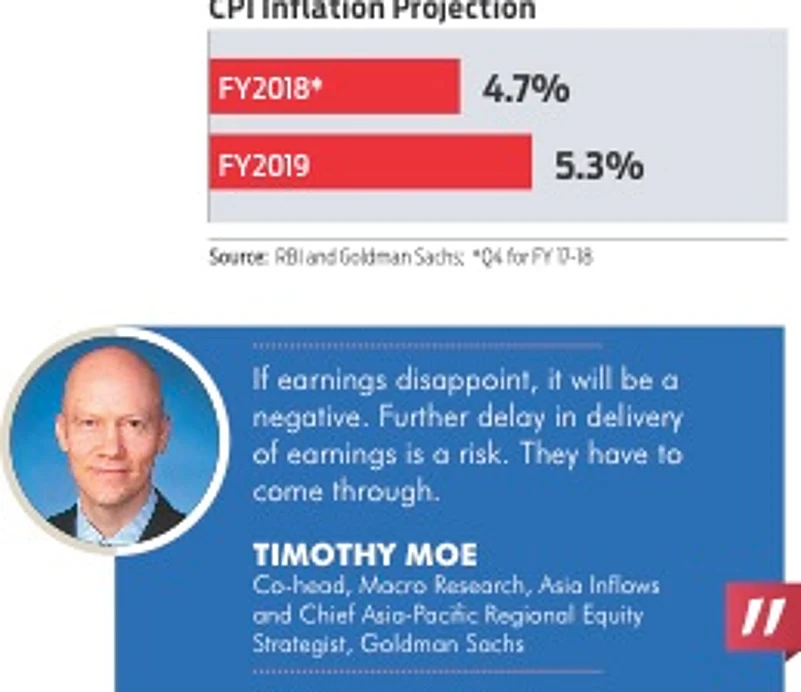 The rush of good news augurs well for the markets, but prudent investors should keep an eye on the risks too. The opportunity - earnings recovery - can also metamorphose into a threat to the equity story, if it fails to take shape in line with expectations. The consensus earnings estimate for FY18 and FY19 are 18 per cent and 16 per cent, respectively. Any slipup on this front poses a threat to the overall positive outlook. “If earnings disappoint, it will be a negative. Further delay in delivery of earnings is a risk. They have to come through,” says Moe of Goldman Sachs. The firm’s chief Asia economist, Andrew Tilton, also counted inflation and vagaries of weather amongst the risk factors, apart from geopolitical risks.