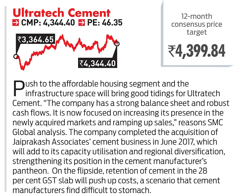 the sun. The sector - road construction and port development, in particular, - may be direct beneficiary of the Bharatmala and Sagarmala projects, as new orders flow in. “NHAI is also likely to ramp up the award process in coming months. Building and urban infrastructure projects are also likely to see increased traction with affordable housing scheme as well as upcoming metro projects,” points out Virmani of Kotak Securities, who is particularly positive on EPC (engineering, procurement, and construction) companies.