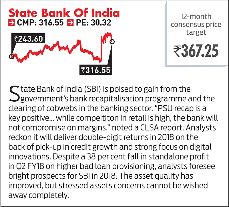 `2 lakh-crore bank recapitalisation programme. The intense activity on the bankruptcy norms front, too, has reignited interest in this space, boosting prospects of both public and private sector banks. Some analysts believe that the worst may be behind for the banking sector. “With PSU bank recapitalisation and Insolvency Act, we expect the banking sector to start witnessing improvement in asset quality,” says Teena Virmani, vice-president, research, Kotak Securities.