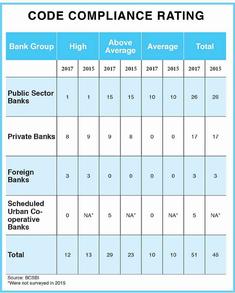 BCSBI is the quasi-regulatory arm of the Reserve Bank of India in charge of devising the code as well as getting banks to adhere to it. The survey, carried out in association with ratings agency CRISIL, polled nearly 8,500 customers of 51 public sector (PSB), private, foreign and urban co-operative banks. It rated banks on four parameters - information dissemination, transparency, customer centricity and grievance redressal – culled from the code, which has been voluntarily adopted by all banks.