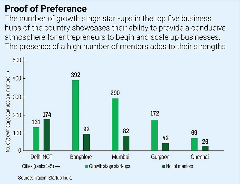 Urban centres like Bangalore, Mumbai, Delhi, Chennai and Gurgaon, also the top five cities in the Outlook Start-Ups Outperformers 2023, offer a blend of workforce, networking opportunities and a vibrant entrepreneurial culture. They have established themselves as innovation hubs with a track record of successful start-ups. These factors together act as a major pull for start-up founders looking for mentorship, access to capital and a supportive ecosystem.