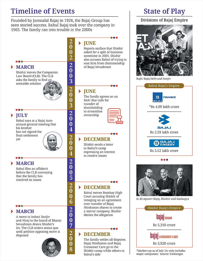At a family gathering in Pune in 2001, Shishir Bajaj told his elder brother Rahul he wanted the family business split. Rahul and his cousins did not want the company splitting. A years-long battle thus ensued