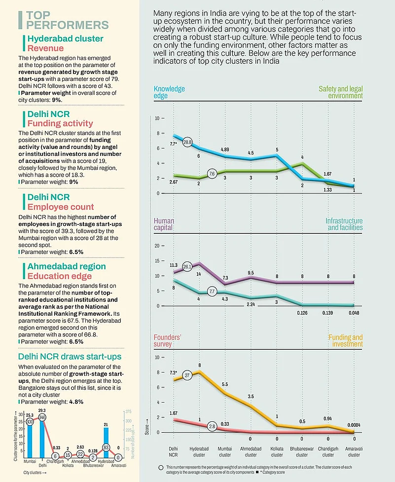 The Outlook Start-Up Outperformers 2023 identified eight city clusters for the purpose of ranking the best start-up ecosystems in India. The Delhi NCR cluster, which includes Gurgaon, Noida and Greater Noida, tops the list. Among individual cities in this cluster, Delhi, with a score of 50.9 and third place in the overall city ranking, is the best performing city even when the popular perception is that major start-up activity takes place in the cyber hubs in its neighbourhood. Gurgaon is ranked fifth in the overall city ranking list with a score of 39.2 and Noida+Greater Noida stands at the 10th spot with a score of 25.4. While Gurgaon and Noida+Greater Noida have scores lower than that of Delhi, the Delhi cluster stays on top since the next best cluster of Hyderabad+Secunderabad has a score closer to Gurgaon and Noida+Greater Noida than Delhi.
