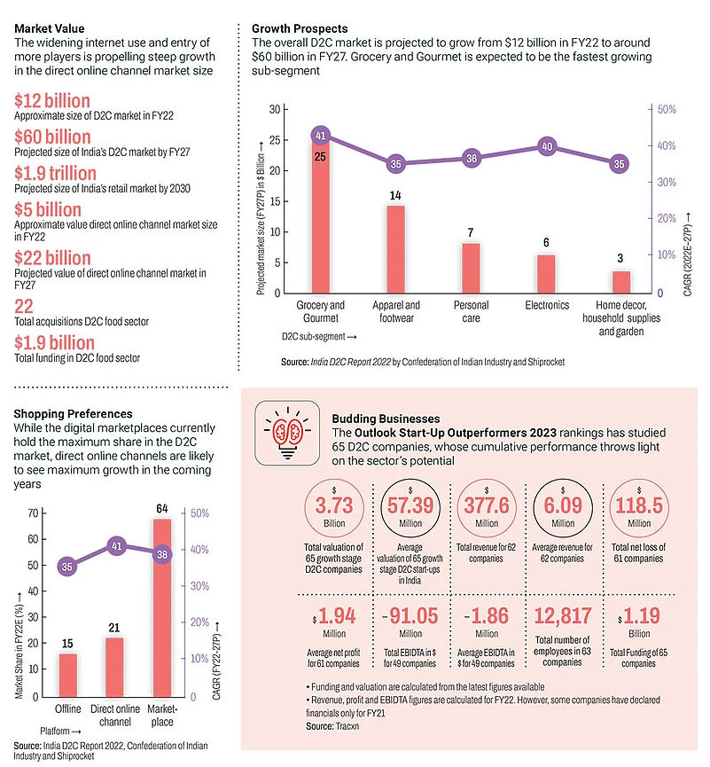 The D2C market is expected to grow at approximately 40% between FY22 and FY27, according to a report by the Confederation of Indian Industry. Powered by technological advancements and strengthening of the digital ecosystem and local demand, numerous manufacturers have started selling directly to the customers. Within the D2C sector, direct online channels are witnessing growth