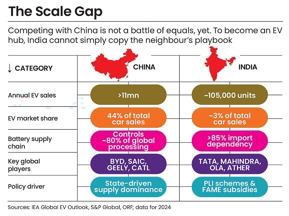 To become a hub, India cannot simply copy the Chinese playbook. Beijing’s dominance was built on massive state-sponsored capital deployment, controlling the entire value chain—from lithium mines in Africa to battery gigafactories in Shenzhen.