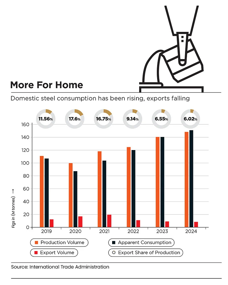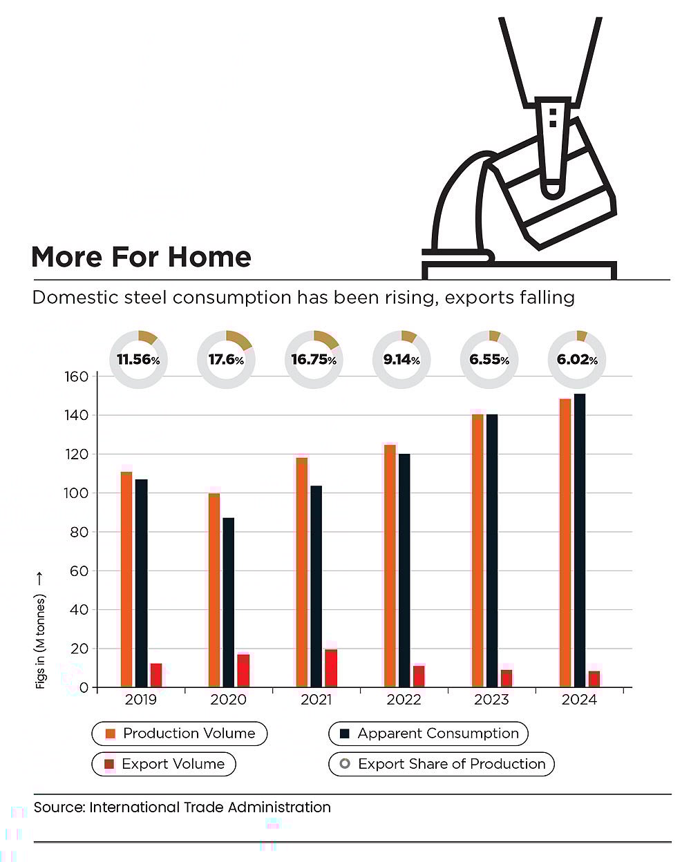 And even though, over the past few years, India has been producing most of the metals for domestic consumption, a developing economy needs to be globally competitive, not just productive. Currently, India exports only 6% of its steel output but has a target of exporting 25mn tonnes by 2047 and growing production capacity to 500mn tonnes.