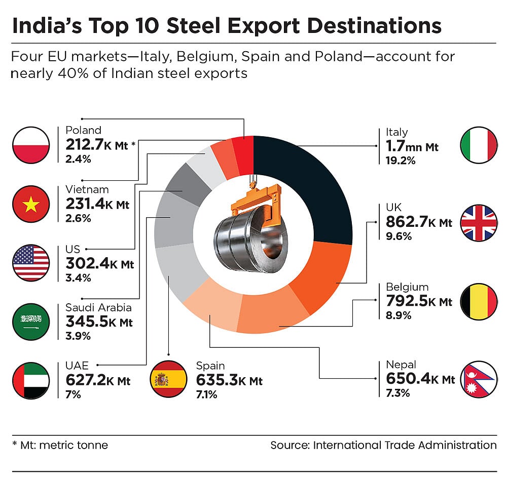 The EU has long been a crucial market for Indian metals, particularly steel. India, the world’s second-largest producer, ships two-thirds of steel exports to Europe. Four EU markets—Italy, Belgium, Spain and Poland—account for nearly 40% of Indian steel exports. In aluminium, a quarter of Indian shipments head to Europe. “The impact on India is likely to be more pronounced due to its higher dependency on the EU market for these goods,” notes Associated Chambers of Commerce and Industry of India.