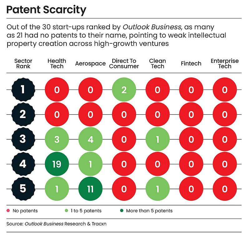 Here’s a troubling number based on our research: of the 30 start-ups across six sectors that have secured top rankings in Outlook Business Outperformers 2026, only nine have patents granted to them. None of the top five start-ups in fintech and SaaS have any patents. In the direct-to-consumer sector, only the start-up in pole position has patents to its name.