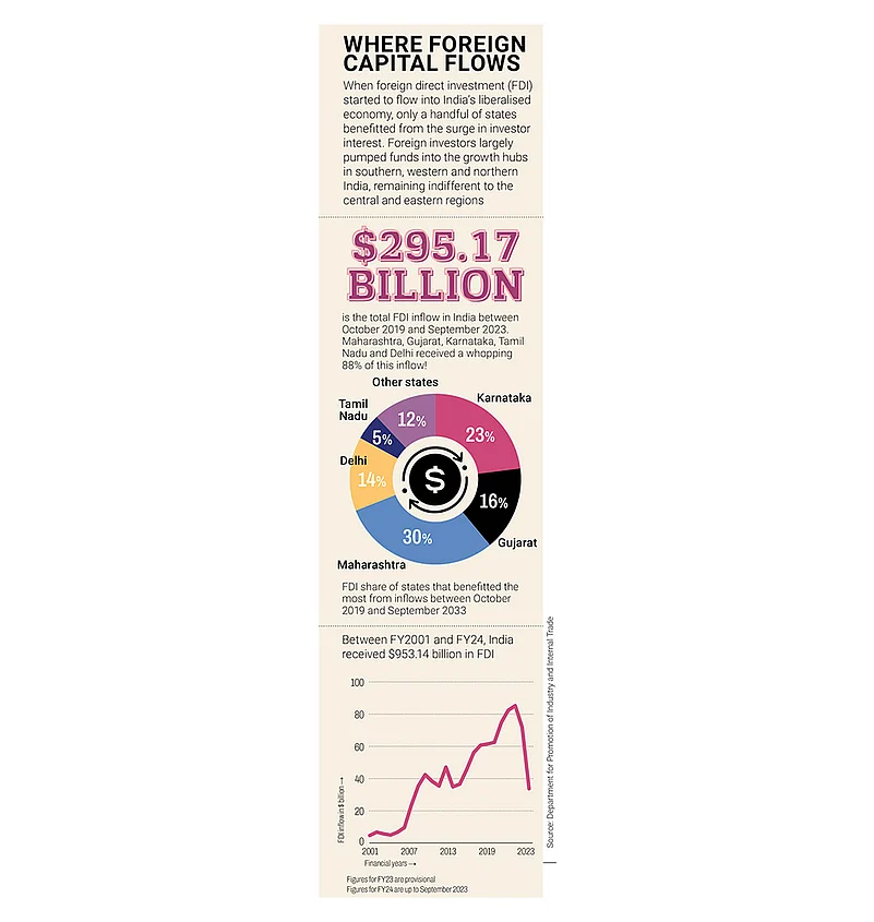 Moreover, Maharashtra, Karnataka and Gujarat alone have cornered 69% of all FDI between October 2019 and September 2023, and, no Central government has made a serious attempt at devising a scheme that can push FDI to the poorer regions.