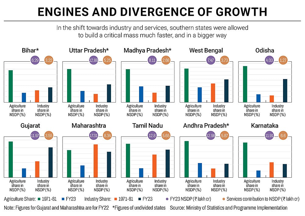 In India’s journey from the Nehruvian socialism to the present-day market-driven economy, if there is one clear winner, it is the clique of southern and western states, and, if there is one unfortunate loser, it is the group of eastern and central states. As India’s economy moved away from depending overwhelmingly on agriculture to a services-driven one, with manufacturing making its dominant appearance every now and then, it is no coincidence that it led to a great divergence in the industrial development of these two groups of states. The earlier reliance on agriculture was more broad-based and spread across the geography of India. In contrast, the industrial clusters, both for services and manufacturing sectors, are concentrated in southern and western states.