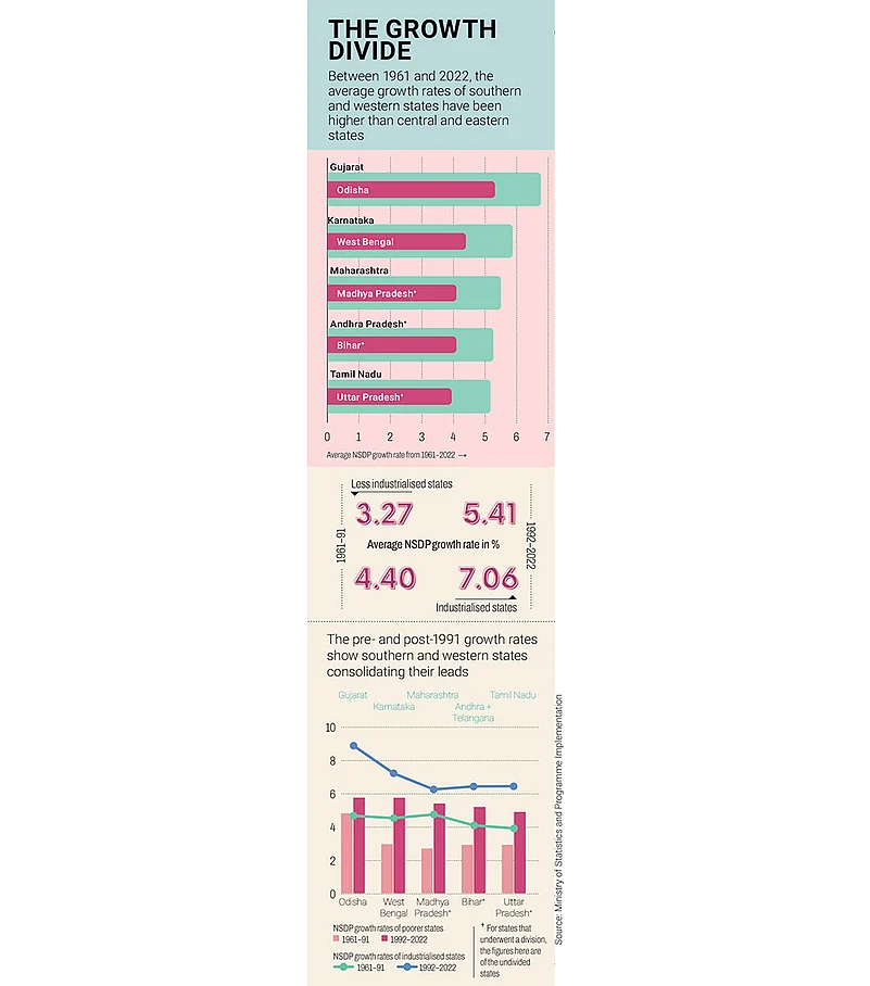 Dehejia’s claim on growth divergence among states can be easily verified in the net state domestic product (NSDP) figures pre- and post-liberalisation. The average NSDP of the poorer states in central and eastern India, comprising Bihar, Uttar Pradesh, Odisha, Madhya Pradesh and West Bengal, between 1961 and 1991, the year when economic liberalisation started in India, was 3.27%, while the NSDP average for the richer states in the west and south, comprising Gujarat, Maharashtra, Karnataka, Andhra Pradesh and Tamil Nadu, in the same period was 4.40%. Though the difference in the states’ growth rates was evidently present even before 1991 at 1.13%, this margin increased from 1992 onwards. The poorer states improved their performance in the 1992–2022 period to hit the average of 5.41%, while the richer ones achieved the average of 7.06%, which is 1.64% higher than the poorer states.