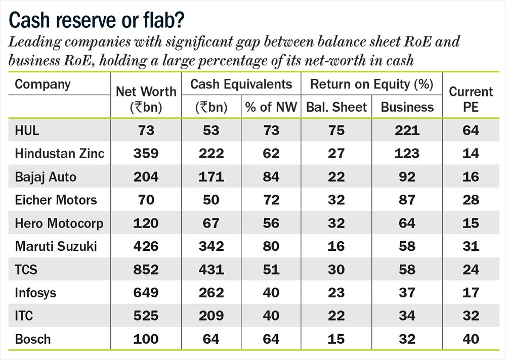 The report also talks about which RoE figure to consider when you value a company — the balance sheet RoE or the core business RoE. Over time, many Indian companies have resorted to holding cash on their balance sheets in excess of their immediate business requirements. This barely earns a 5% post-tax yield which drags down the overall RoE (see: Cash reserve or flab?). While in some cases the market is able to compute the core RoE and value companies accordingly, in others, the report says that the market fears capital misallocation and this becomes an overhang on the company’s valuation. In such cases, the gap between balance sheet RoE and business RoE can be brought down through a combination of higher dividend payout and share buyback.